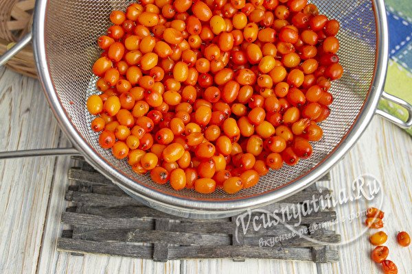 - Из облепихи любым удобным способом выжмите сок. Лучше всего пропустить ягоды через соковыжималку.
