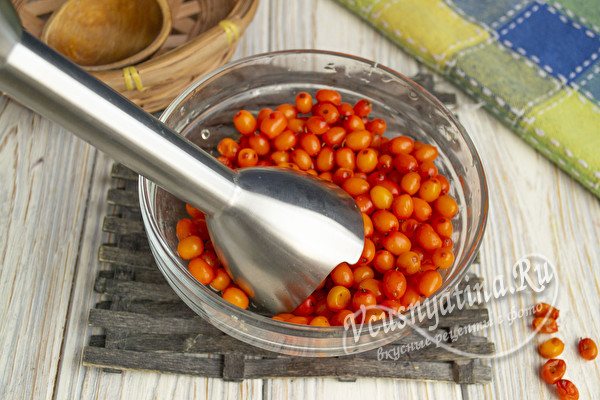- Облепиху с сахаром перебейте в блендере до однородности.