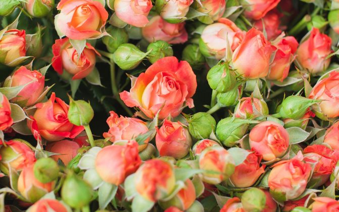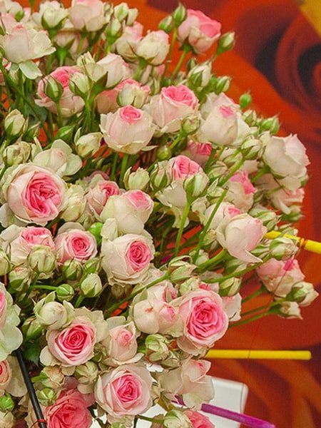 Розы Спрей – это группа подвидов, схожих с флорибундами. Их отличительной чертой является низкорослость кустарников. Они достигают ввысь около 60 сантиметров. Цветки миниатюрные, красивые, от 3 до 7 см диаметром. На одной ветке располагается 10-15 почек. Распускаются они равномерно, один побег представляет собой полноценный букет. Во флористике цветы применяют не только для создания свадебных связок, но и в виде фона для более крупных культур в сложных композициях.