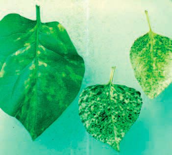 Обычно первые признаки вирусных заболеваний появляются уже ранней весной на молодых листьях сирени. Симптомы исключительно разнообразны, изменяются в течение вегетации, зависят от вида вируса, сорта и состояния растения, экологических условий, сопутствующих инфекций. Наиболее распространенными и характерными признаками проявления вирусов на сирени являются различные типы мозаики, для которых типично изменение окраски листьев (цветков). Мозаики подразделяются на множество разновидностей в зависимости от окраски и расположения рисунка. Например, это могут быть мелкие желтые пятна, которые постепенно сливаются и охватывают всю листовую пластинку (рис. 1). Мозаика может ограничиваться отдельными участками или захватывать весь лист, напоминая мраморность. Рисунок белого цвета часто сопровождается резким (контрастным) хлорозом (рис. 2). Листья при этом могут становиться практически белыми, на них остаются лишь отдельные зеленые участки. Как правило, посветление тканей листа наблюдается только вдоль центральной и боковых жилок. Мозаика может проявляться на молодых листьях в виде светлых расплывчатых пятен между жилками. Иногда наблюдается кольцеобразный рисунок, а края некоторых листьев слегка загибаются вверх. Крапчатость на сирени встречается довольно часто, но симптомы обычно выражены нечетко, появляются весной, бывают видны в течение двух-трех недель, затем исчезают. В латентном состоянии этот вирус зафиксирован на многих видах и сортах сирени, он также поражает гвоздику и некоторые другие культуры.
