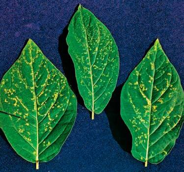В июле на верхней стороне листьев появляются крупные темно-охряные пятна, иногда окруженные более темной каймой. На пятнах развивается спороношение возбудителя в виде мелких черных точек.