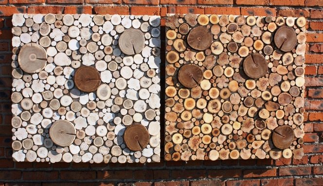 Левое панно это просто просушенные и отшлифованные спилы, в которые для контраста добавлены два спила дуба, пропитанных специальным маслом. Именно масло для пропитки дерева мы чаще всего используем для покрытия наших деревянных спилов. Двукратная пропитка маслом очень красиво проявляет структуру и рисунок деревянного спила, защищает его от внешних воздействий, придает бархатистую матовость поверхности, наполняя древесные поры. Не случайно паркеты из ценных пород дерева пропитывают именно маслами, а в последующем уходе натирают воском.