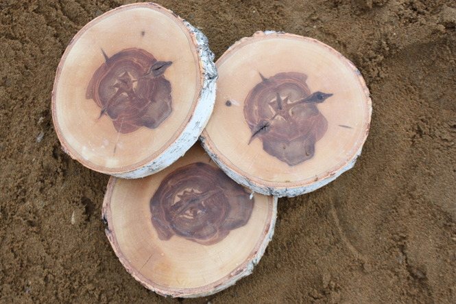 Ну и конечно, спилы из дерева можно красить. Чаще всего, крашеные спилы из дерева используют для оформления свадеб и витрин магазинов, когда необходимо декорировать интерьер в строго заданном цвете. Цвет может быть любым, мы подбираем его по колеровочным веерам.