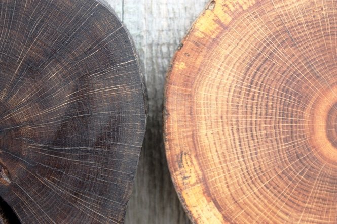Вот эта фотография двух однотипных интерьерных панно из спилов дуба, клена, туи, березы, липы, которое доступно для заказа в магазине спилов , очень наглядно иллюстрирует разницу между спилами с покрытием и без покрытия.