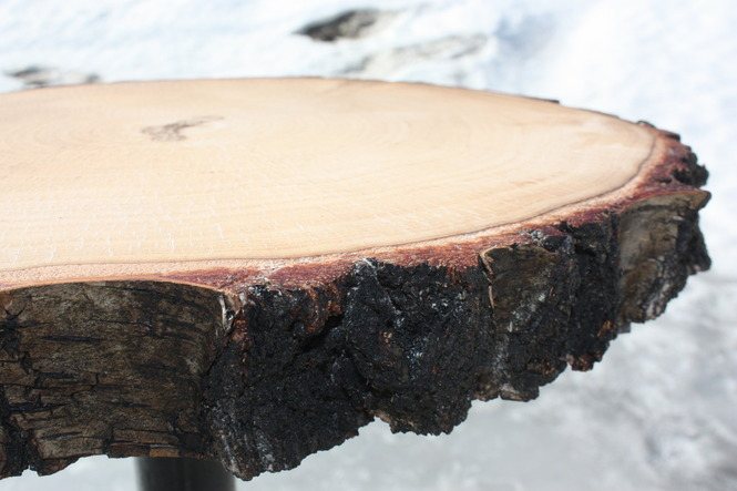 Покрытие лаком, на наш взгляд, немного простоватое покрытие для деревянного спила. Даже самый легкий матовый лак создает на поверхности небольшую бликующую пленку, а также некоторую шероховатость, по сравнению с другими видами пропитки спила из дерева. Поэтому, лак для покрытия спилов дерева любой породы мы используем очень редко, только по просьбе наших заказчиков.