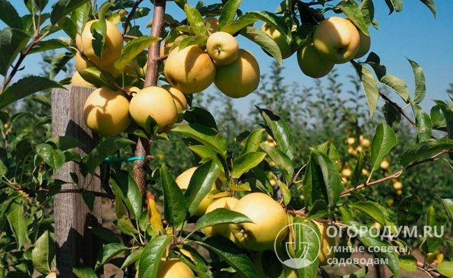 Низкорослые яблони имеют ствол высотой около 120 см, выше не становятся, диаметр кроны около 5 метров. Они растут на средне и сильнорослых подвоях.