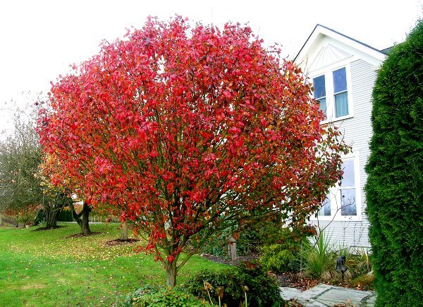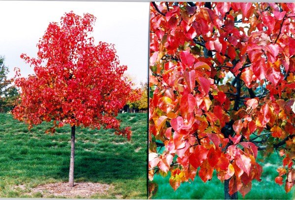 «Autumn Blaze Pear». Широко известен своими блестящими, огненно-оранжевыми осенними листьями, которые к середине ноября становятся темно-бордовыми. Крона пышная, округлая.