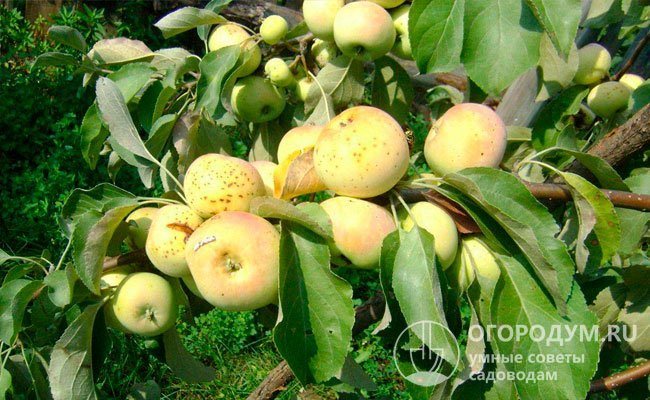 «Приземленное»Позднеосенний, частично самоплодный. Яблоки среднего размера, желтые со слабым румянцем, могут храниться до 2 месяцев. Потребительские качества оцениваются достаточно высоко.