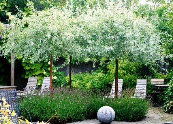 Декоративная груша иволистная (Pyrus salicifolia) — вид с узкими, серо-зелеными листочками представлен прекрасным карликовым сортом «Пендула» с плакучими побегами и округлой кроной.