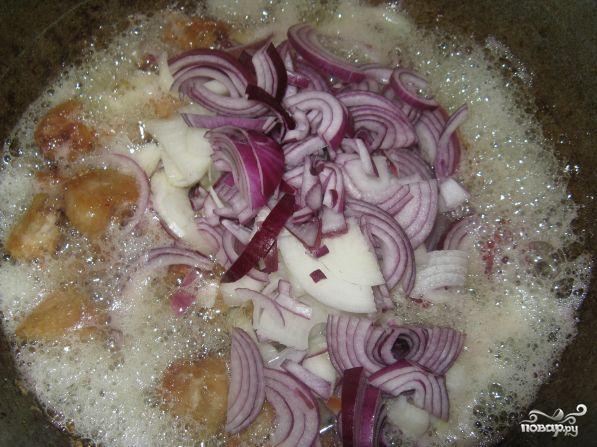 - Добавить мелко нашинкованный лук, продолжать обжаривать не менее 10 минут.