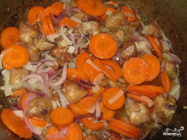 - Там, где жарился основной ингредиент блюда, пассеровать лук и морковку. Отправить к гузкам.