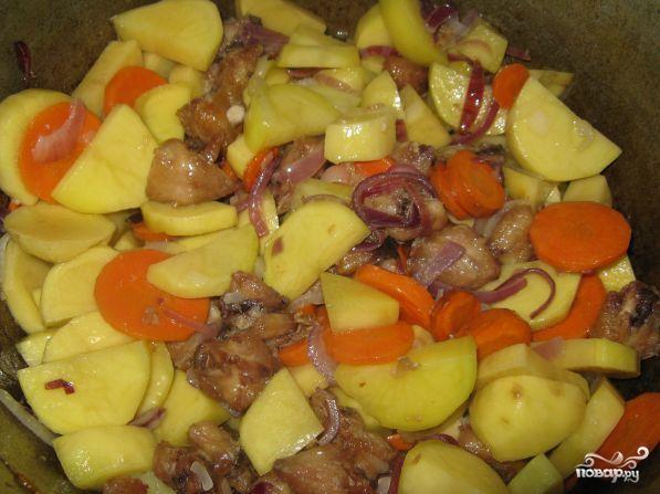 Затем в казан добавить произвольно нарезанную картошку. Как обычно — перемешать.