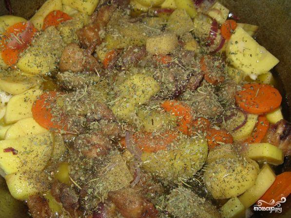- Блюдо посолить и приправить специями, прикрыть крышкой, тушить не менее часа на умеренном огне.