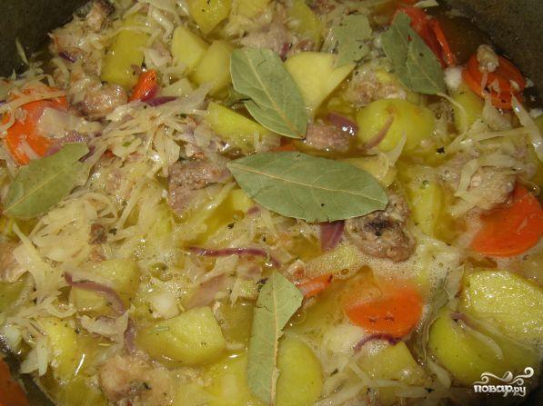 Последней добавляется нашинкованная капуста. Она готовится быстрей всех. Ей нужно около 7-8 минут. Затем добавить лавровый лист для пущего запаха.