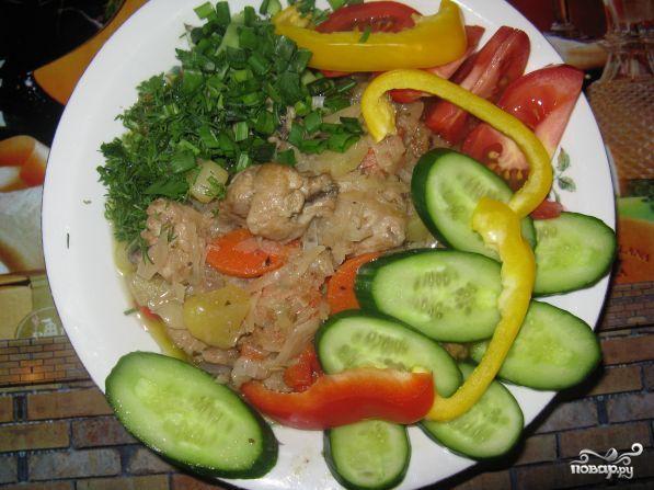 Казан накрываем крышкой и оставляем тушиться на медленном огне около 15 минут. В это время следует нарезать свежие овощи.