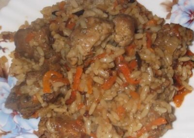 - В емкости для плова обжарить лук, добавить просоленные гузки.