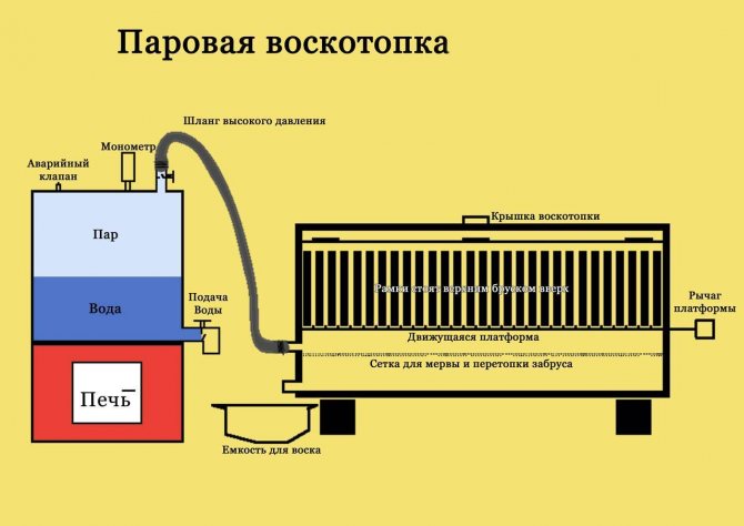 Элементарная паровая конструкция, изготовление которой доступно даже начинающему пчеловоду, представляет собой металлическую емкость в форме цилиндра, до середины которой наливают воду. Сверху на нее помещают сетчатую тару, закрепленную крючками к краям бака. Туда кладут сырье, подлежащее обработке. Сосуд ставят на источник тепла, доводят до кипения. Поднимаясь, пар растапливает воск, тот стекает вниз и после охлаждения воды застывает поверх нее, не смешиваясь с ней.