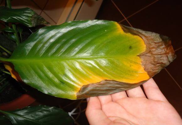 Пожелтение листьев не нужно путать с подсыханием кончиков, при котором остальная поверхность листовых пластин остается зеленой. Подсыхание кончиков обусловлено недостаточной влажностью воздуха, этот дефект не слишком отражается на здоровье и декоративности «женского счастья». Чтобы улучшить вид растения, сухие участки можно просто обрезать ножницами.