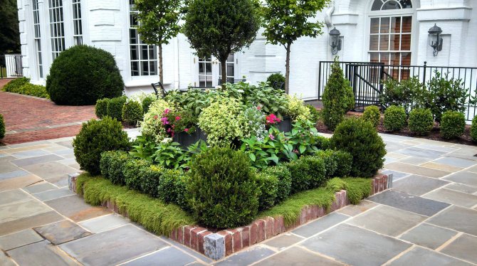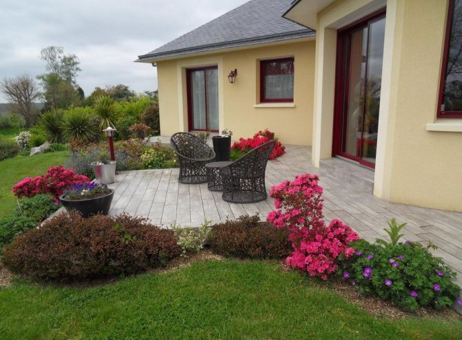 Цветы возле крыльца или под окнами дома всегда ни виду. Если плиткой закрыта большая площадь, то имеет смысл использовать вазоны (лучше на колесиках), кашпо. По периметру дома цветы оформляют рабатками или миксбордерами. Чему отдать предпочтение – яркому обилию цветов или лаконичным хвойникам – дело вкуса.