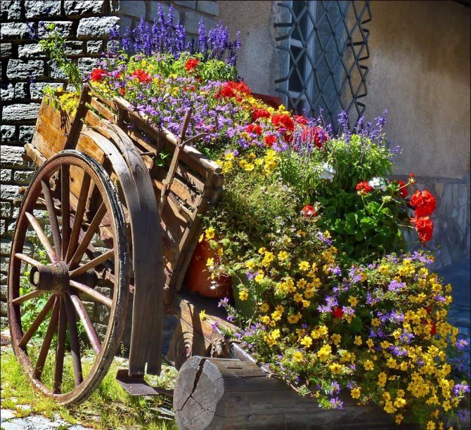 Красивая клумба на старой тележке на даче