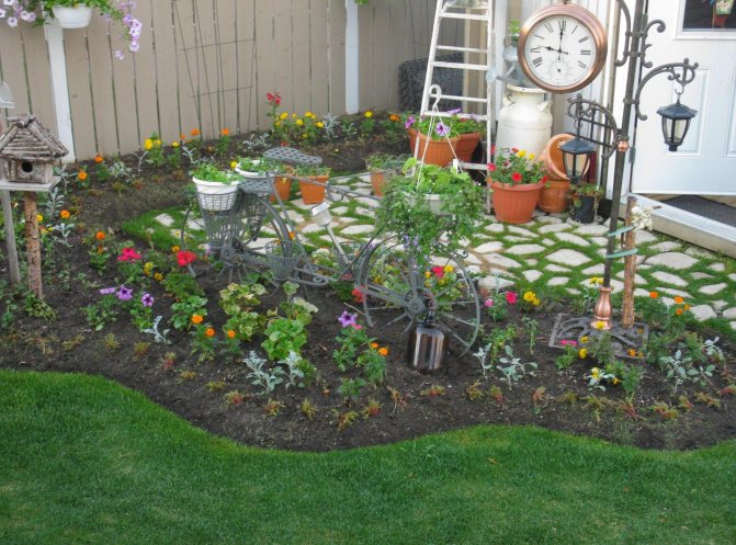 Оригинальные идеи оформления клумб и цветников на даче своими руками – использование ненужной техники. Старый велосипед фиксируют и весь окрашивают в яркий цвет. За сиденьем и перед рулем устанавливают вазоны с цветами.