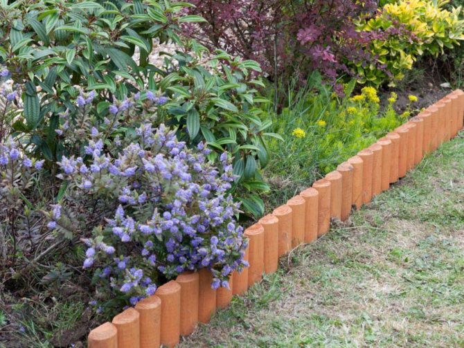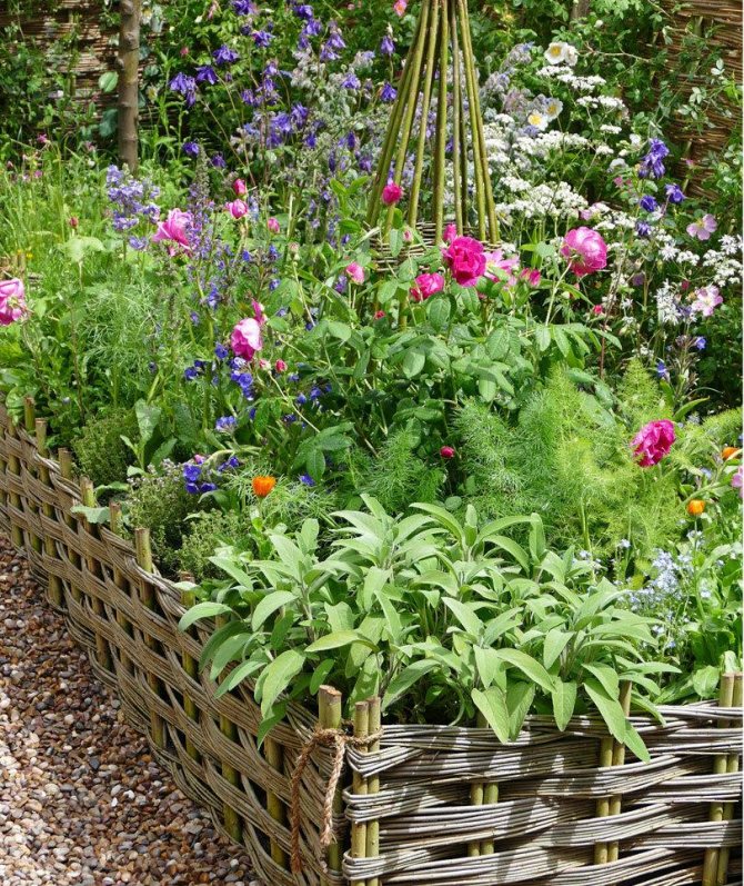 Клумба с плетеными бортиками на даче