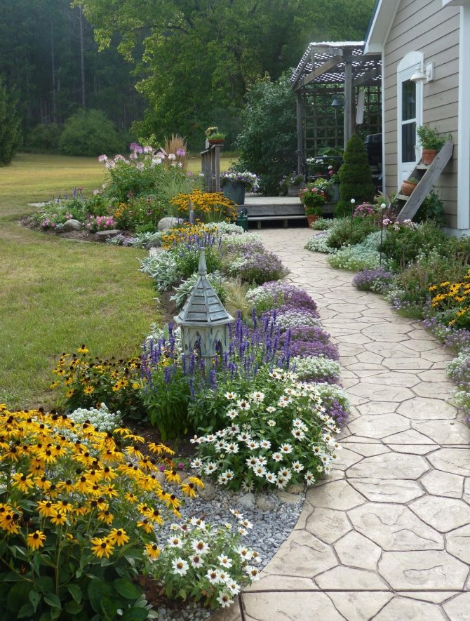 Цветники вдоль тропинок – идеальный вариант декорирования участка.