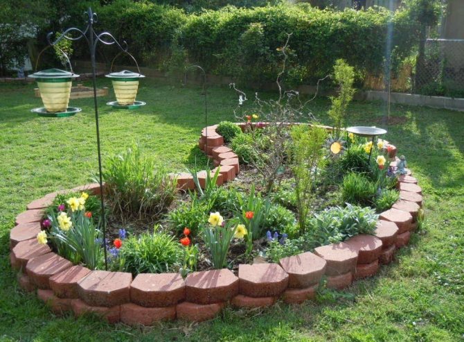 Необычные цветники создаются с помощью строительных материалов (шифер, асбестоцементные листы, кирпич). Бордюры облегчают уход за клумбой.