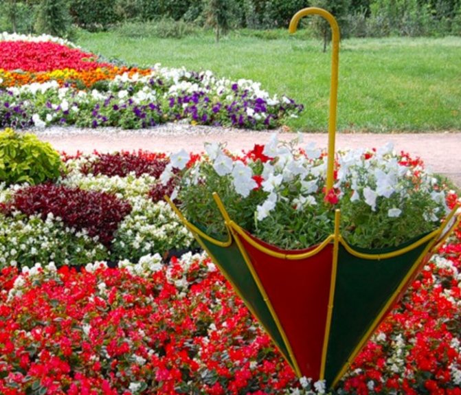 Нарядный цветущий зонтик. Оригинальные клумбы из знакомых предметов