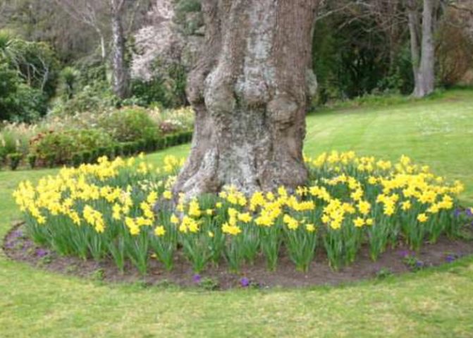 Цветник одновременно красиво декорирует приствольный круг и защищает дерево от вредителей. К выбору растений надо подойти внимательно – не все могут полноценно расти в тени. Под садовыми деревьями с рассеянными кронами высаживают анютины глазки, настурции, крокусы. Оригинальные идеи создания цветников под плотной кроной: