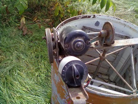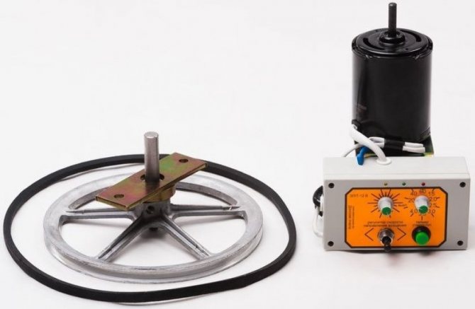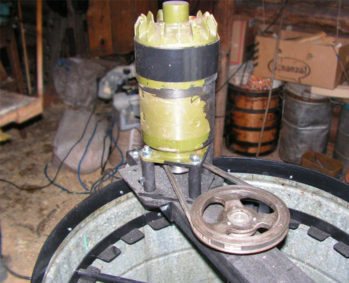 Удобно электрически регулировать обороты, для этого понадобится электрический мотор, он имеет напряжение 220 вольт. Предварительно демонтируется ручной привод.