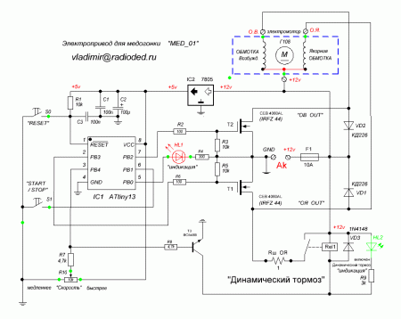 В основе схемы лежит всего одна микросхема. Она управляет тремя мощными полевыми транзисторами, благодаря которым можно управлять токами до 30 ампер. Для нормальной работы медогонки эту схему пришлось немного доработать. Была внедрена система плавного старта электропривода, а также таймер работы: