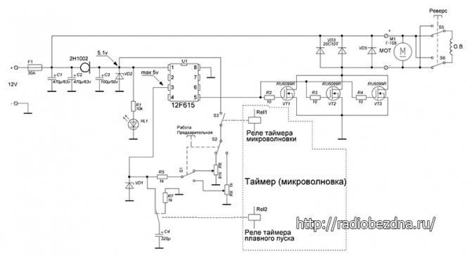 Управление электродвигателем осуществляется при помощи двух блоков. Первый блок представляет из себя таймер работы, за основу которого был взят пульт от микроволновой печи. Во втором блоке размещается широтно-импульсный регулятор (ШИМ), при помощи которого задаются нужные обороты электродвигателя: