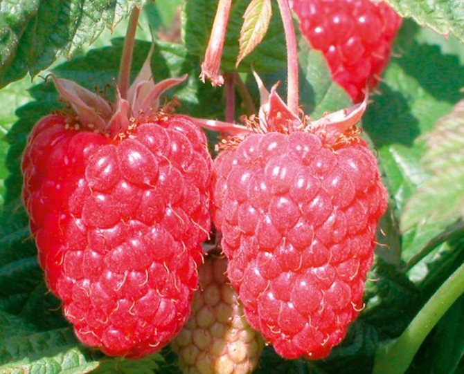 - Плоды крупные – вес в среднем 5.6-8.5 г, удлиненно-конической формы, плотные, в меру сочные, костянка хорошо сцеплена, семена мелкие. Ягоды ярко-красного цвета, с небольшим слабо выраженным блеском, после сбора не темнеет, блестящие, сладкие, с выраженным настоящим малинным ароматом. Отрыв легкий, в т.ч. при технической спелости.