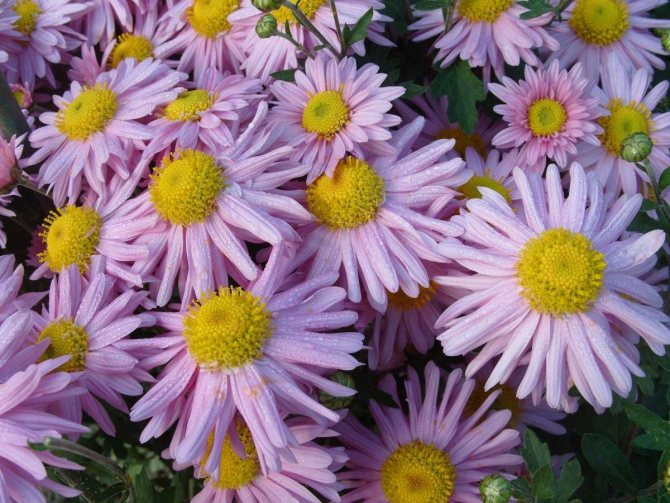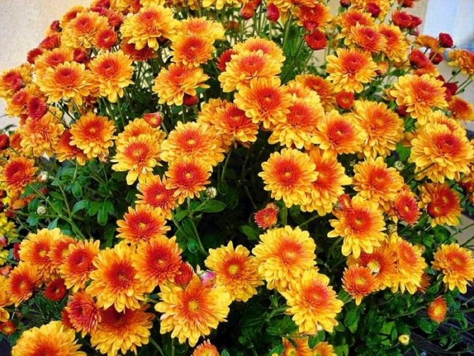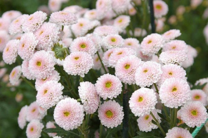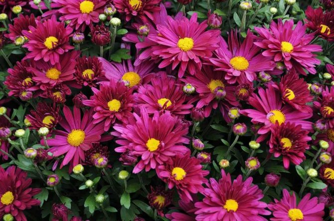 У поздних хризантем практически все цветки находятся на одном уровне. Многолетник выглядит как шикарный букет, украшая экстерьер участка. Цветет с начала осени и до первых заморозков. Высаживать такие сорта лучше в слегка притемненных зонах. Подойдет любая почва с перегноем, обеспечивающая высокому цветку хорошее питание. Популярные сорта: