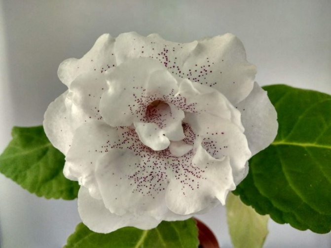 Очень утонченное и аристократическое по внешнему виду растение! Цветок по форме крупного граммофона, около 10 см. Окрас белый в мелкую и густую красную крапинку. Края волнистой формы.
