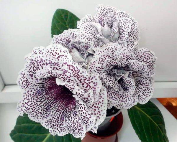 - Клеопатра относится к самым красивым сортовым разновидностям. Ее большие белые цветы махровой формы, имеющие волнистые края, украшены крапинками темно-фиолетового, пурпурного или лилового цвета, фото этих цветов прикреплено к статье;