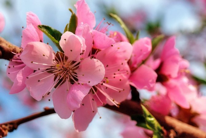 Цветки «Воронежского кустового» персика очень декоративные – крупные и имеют нежно-розовую окраску лепестков. По внешнему виду они идентичны цветкам косточковых культур из семейства Розоцветных.