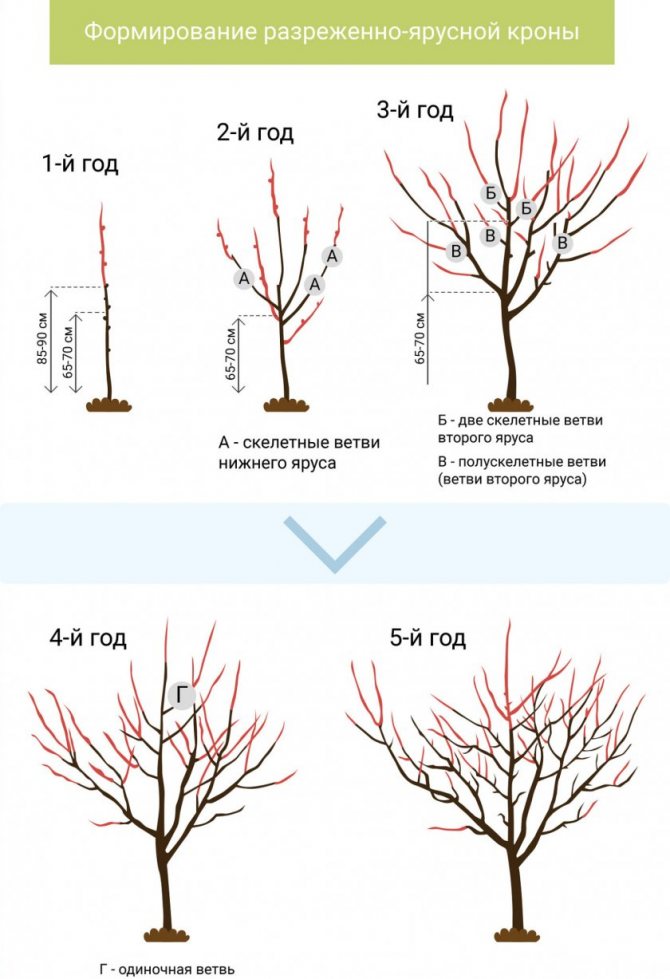 До 70 см урезают основные ростовые побеги на второй год. Также ветви, расположенные внизу и вверху, особо крепкие, удаляют. Боковые ветви прореживают. Прореживание стимулирует формирование крупных плодов. Оставшиеся завязи уменьшают на 2 почки.