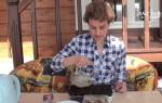 . Варим 3 яйца. А в другой посуде доводим до кипения 1 л воды, добавляем 1 лаврушку, соль и молотый чёрный перец по вкусу. Промываем 3 кальмара и варим не более 1 минуты. Даём им остыть и нарезаем соломкой мелко. Очищаем яйца и натираем их на крупной тёрке. Таким способом и измельчаем 200 г твёрдого сыра. 3 помидора нарезаем крупными кубиками. Петрушку и кориандр овощной промываем и режем крупно. Все компоненты салата перемешиваем и заправляем 200 г майонеза. Это блюдо подойдёт и к простому семейному обеду, и к праздничному столу. Особенно оно порадует любителей морепродуктов. - Простой суп — тюря