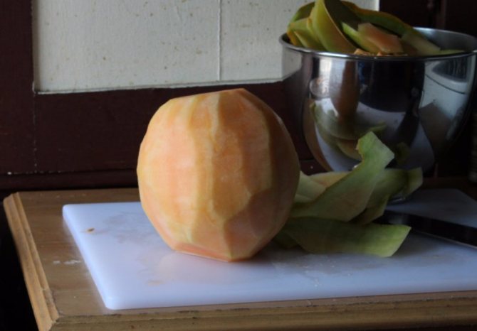 Дыню разрезают на дольки толщиной 2-3 см, удаляют семена и срезают кожуру вместе со слоем зеленой мякоти – он непригоден для приготовления вяленой дыни.