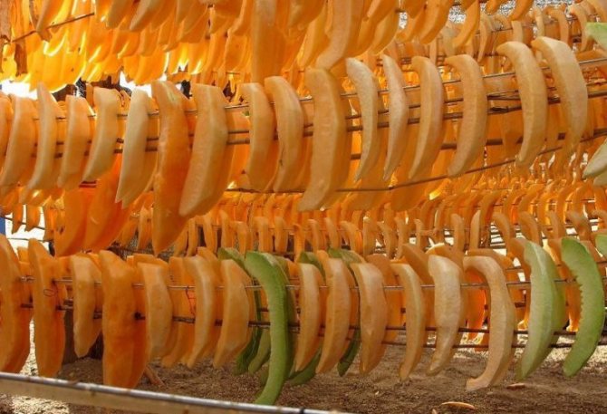 Однако, и в зимнее время любителям дыни есть возможность побаловать себя любимым лакомством. Для этого душистый десерт сушат (вялят) при помощи специальных сушилок, духовых шкафов или просто на свежем воздухе.