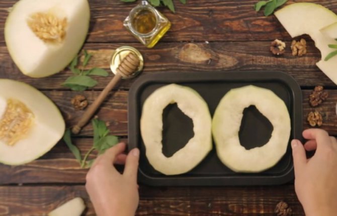Дыню используют как начинку в запеканках, пирогах. Для этого полоски нарезают на мелкие кубики и заливают водой, варят для удаления лишней жидкости и до полного размягчения.
