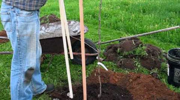 - Молодое деревце нуждается в хорошей опоре. Для этого саженец обязательно привязывают к колышку, который вбивают в землю на глубину 15-20 сантиметров. Подвязывать следует тканью или мягкой веревкой, но ни в коем случае нельзя это делать проволокой или синтетическими материалами.
