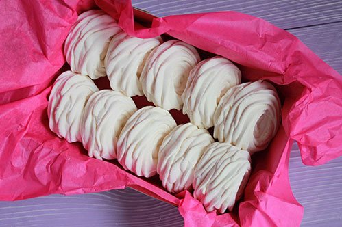 Чтобы придать зефиру требуемую форму, его вкладывают в специальные формочки и дают застыть. У зефира есть много различных сортов.