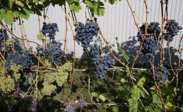 Три года назад купила несколько саженцев синего плодового Викинга. Сказать, что я в восторге от этого сорта не могу, уж больно он капризный и много забот доставляет, да и от ос отбоя нет. Но ягода очень вкусная – этого не отнять. Еще один позитив – ягоды могут висеть на лозе два месяца и более, главное чтобы птицы и осы не добрались до них.
