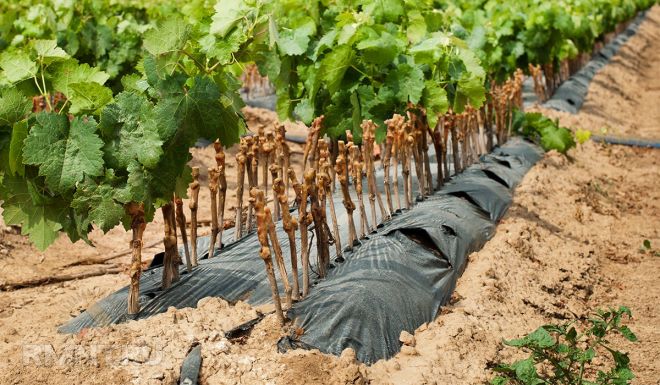 Обязательно сверху укладывается нетканный материал. Это предотвратит загнивание почек. Далее необходимо уложить лозу на покрытие, которое защищает корни.
