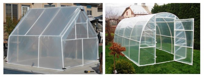 Слева — скатная, справа — арочная теплица из пластиковых труб