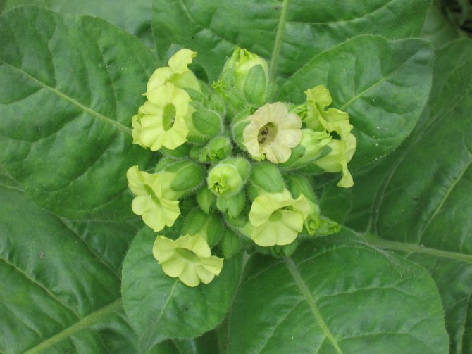 Листва табака душистого тёмно-зелёная, а цветочные бутоны похожи на граммофоны в закрытом виде.