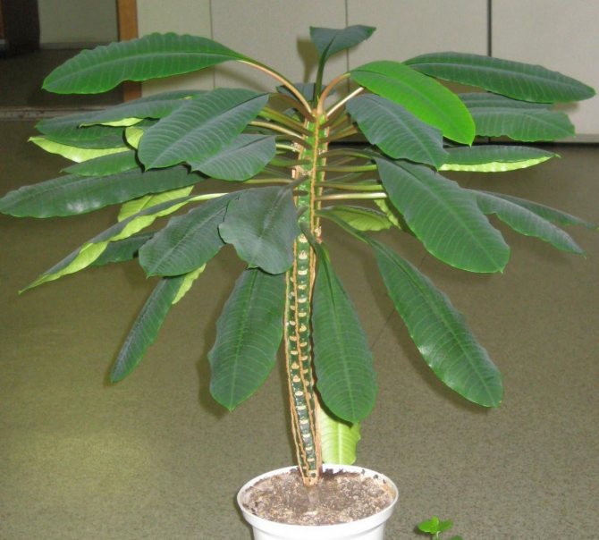Это многолетний разветвленный кустарник с ребристым серым стеблем, листья располагаются на верхушке. Молочай Миля отличается оранжевыми, желтыми и красными прицветниками.